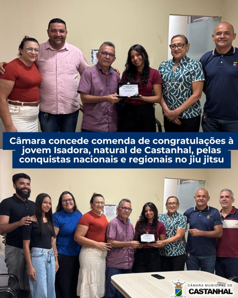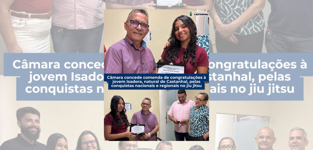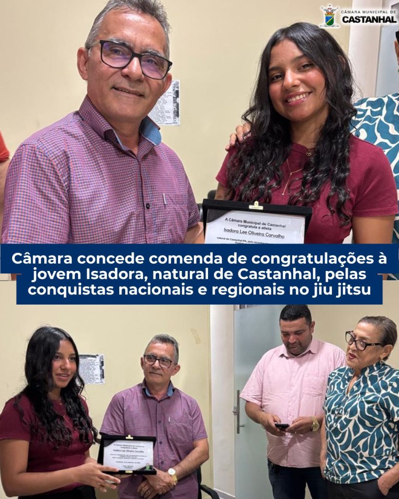 Uma jovem natural de Castanhal recentemente foi destaque em Goiás, e recebeu comenda de reconhecimento da Prefeitura de Bela Vista, por conta de seu desempenho no jiu jitsu. A jovem Isadora Lee Oliveira Carvalho tem tido várias conquistas a nível nacional e regional, com isso, tem levado adiante o nome de seu estado de coração e também seu estado de origem, o Pará, do qual recebe também uma homenagem através da comenda da Câmara Municipal de Castanhal. A breve cerimônia para entrega da comenda contou com a presença do Presidente da Casa, Nivan Noronha, e dos vereadores Jurinha dos Anjos, Rita Rodrigues, Regina Abreu e Elton Sampaio.